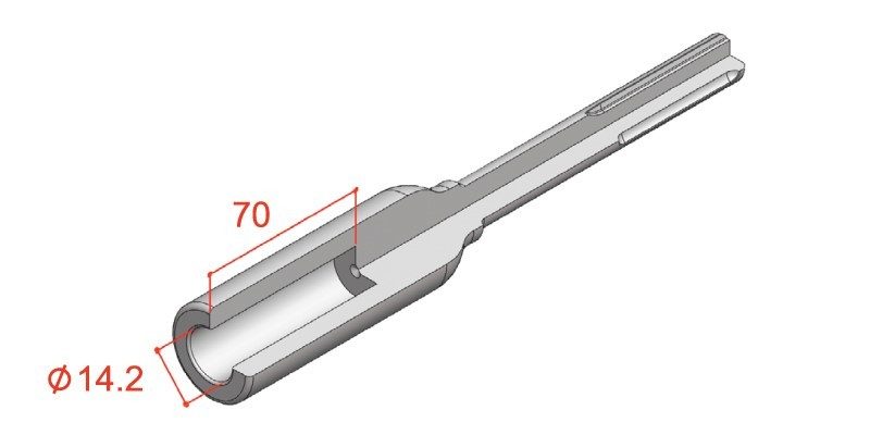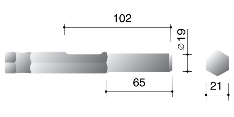 227 shank hammer tools have a 21mm hex body with retention scallop on the flat and a 65mm X 19mm round spigot. A medium duty range of tools, they fit machines such as Hitachi H55SC, Kango 900 and 950, Makita HM1200K and Atlas Copco PB10C.