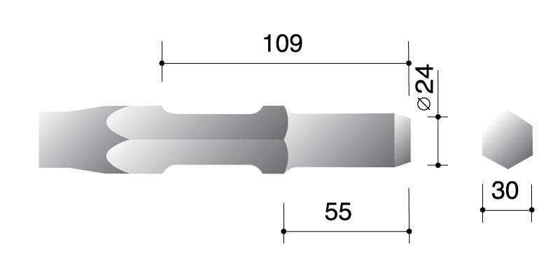253 shank hammer tools have a 30mm hex body with 2 retention scallops on opposing flats. This makes them reversible where particular applications wear one side of the blade. A heavy duty range of tools, they fit machines such as Bosch GSH-16, Hitachi H65, Makita HM1300, Ryobi CH500P and many other generic machines. All 226 shank hammer tools are to be used in the hammer only mode.