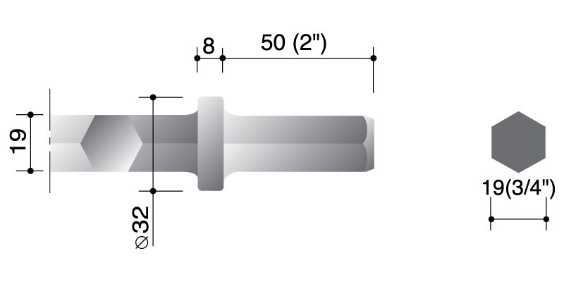 131 shank hammer tools have a 19mm hex body and a 19mm x 50mm hex spigot with a 32mm x 8mm collar.